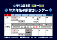 開始停止 本日の開館状況 りぶらん 表郷 大信 東 図書館名をクリックすると開館カレンダーに推移します お知らせ 2025月12月26日 お知らせ 年末年始休館のお知らせ いつも白河市立図書館をご利用いただき、ありがとうございます。 市内4図書館は、年... 2025月12月25日 お知らせ 1月のおはなし会のお知らせ【りぶらん】 絵本の読み聞かせや、手遊びなどをします。 りぶらんのおはなしの小屋に集合! ぜひ... 2025月12月23日 イベント 1月のこども向け上映会のお知らせ【りぶらん】 1月のこども向け上映会は以下の作品を上映します。入場無料、申込不要。ぜひご来場く... 2025月12月23日 イベント 1月の大人向け上映会のお知らせ【りぶらん】 1月の大人向け上映会は以下の作品を上映します。入場無料、申込不要。 日 時:令... 2025月12月10日 【お知らせ】地域交流会議室の予約受付期間を延長します 令和8(2026)年1月8日(木)から、地域交流会議室の予約受付期間を延長しま... 過去のお知らせを見る>>