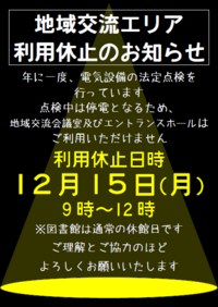 開始停止 本日の開館状況 りぶらん 表郷 大信 東 図書館名をクリックすると開館カレンダーに推移します お知らせ 2025月12月14日 お知らせ 【12/15】地域交流エリア利用休止のお知らせ 地域交流エリア 利用休止のお知らせ(12月15日) 平素より市立図書館をご利用... 2025月12月10日 【お知らせ】地域交流会議室の予約受付期間を延長します 令和8(2026)年1月8日(木)から、地域交流会議室の予約受付期間を延長しま... 2025月12月04日 お知らせ 【12/4】移動図書館車運休のおしらせ 本日12/4(木)は天候不良のため、移動図書館車ゆるりぶの下記の運行予定を中止... 2025月11月29日 お知らせ 12月のおはなし会のお知らせ【りぶらん】 絵本の読み聞かせや、手遊びなどをします。 りぶらんのおはなしの小屋に集合! ぜひ... 2025月11月26日 イベント 12月のこども向け上映会のお知らせ【りぶらん】 12月のこども向け上映会は以下の作品を上映します。入場無料、申込不要。ぜひご来場... 過去のお知らせを見る>>