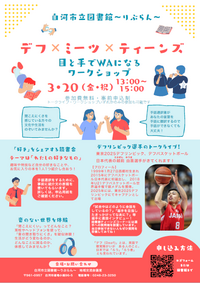 開始停止 本日の開館状況 りぶらん 表郷 大信 東 図書館名をクリックすると開館カレンダーに推移します お知らせ 2026月03月13日 お知らせ 【りぶらん】イベント「デフ×ミーツ×ティーンズ~目と手でWAになるワークショップ~」【3/20】 白河市立図書館りぶらんで聴覚障がいについて理解を深めるイベントを開催いたします。... 2026月02月26日 イベント "聞かせ屋。けいたろう"さん登場!『親子向け絵本ライブ』&『大人向け絵本講演会』【3/22】 "聞かせ屋。けいたろう"さん登場!『親子向け絵本ライブ』&『大人向け絵本講演会』... 2026月02月18日 イベント 3月の大人向け上映会のお知らせ【りぶらん】 3月の大人向け上映会は以下の作品を上映します。入場無料、申込不要。 日 時:令... 2026月02月18日 イベント 3月のこども向け上映会のお知らせ【りぶらん】 3月のこども向け上映会は以下の作品を上映します。入場無料、申込不要。ぜひご来場く... 2026月01月30日 【重要】りぶらん特別整理期間(蔵書点検)中の地域交流会議室の受付について りぶらん特別整理期間(蔵書点検)中の地域交流会議室の受付について りぶらん特別整... 過去のお知らせを見る>>