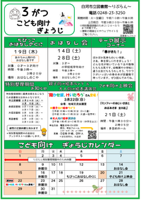 2026月03月29日 お知らせ 4月のおはなし会のお知らせ【りぶらん】 絵本の読み聞かせや、手遊びなどをします。 りぶらんのおはなしの小屋に集合! ぜひ... 2026月03月24日 イベント 4月のこども向け上映会のお知らせ【りぶらん】 4月のこども向け上映会は以下の作品を上映します。入場無料、申込不要。ぜひご来場く... 2026月03月21日 お知らせ 【東図書館】電話回線の不具合解消のお知らせ (3/21) 3月21日10時現在、東図書館の電話回線の不具合が解消され、回線が復旧しました。... 2026月03月19日 お知らせ 【お知らせ】東図書館は3月21日(土)から通常開館します 2026年3月21日(土)から通常開館します 水漏れのため休館していた東図書館で... 2026月03月19日 イベント 4月の大人向け上映会のお知らせ【りぶらん】 4月の大人向け上映会は以下の作品を上映します。入場無料、申込不要。 日 時:令... 2026月03月13日 お知らせ 【りぶらん】イベント「デフ×ミーツ×ティーンズ~目と手でWAになるワークショップ~」【3/20】 本イベントは開催延期となりました。延期後の日程は当館ホームページにてあらためてお... 2026月02月26日 お知らせ 3月のおはなし会のお知らせ【りぶらん】 絵本の読み聞かせや、手遊びなどをします。 りぶらんのおはなしの小屋に集合! ぜひ... 2026月02月26日 イベント "聞かせ屋。けいたろう"さん登場!『親子向け絵本ライブ』&『大人向け絵本講演会』【3/22】 "聞かせ屋。けいたろう"さん登場!『親子向け絵本ライブ』&『大人向け絵本講演会』... 2026月02月18日 イベント (終了しました)3月の大人向け上映会のお知らせ【りぶらん】 3月の大人向け上映会は以下の作品を上映します。入場無料、申込不要。 日 時:令... 2026月02月18日 イベント (終了しました)3月のこども向け上映会のお知らせ【りぶらん】 3月のこども向け上映会は以下の作品を上映します。入場無料、申込不要。ぜひご来場く... 2026月01月30日 【重要】りぶらん特別整理期間(蔵書点検)中の地域交流会議室の受付について りぶらん特別整理期間(蔵書点検)中の地域交流会議室の受付について りぶらん特別整... 2026月01月30日 【重要】特別整理期間(蔵書点検)の休館のお知らせ 特別整理期間(蔵書点検)の休館のお知らせ 蔵書点検を行うため、市内の4図書館は下... 2026月01月23日 お知らせ 福田里香さん講演会「物語をおいしく読み解く」 開催【2/21】 手がけた多くのレシピ本とともに、漫画やドラマなどの中で慣用句のように登場する食べ... 2026月01月22日 イベント (終了しました)2月の大人向け上映会のお知らせ【りぶらん】 2月の大人向け上映会は以下の作品を上映します。入場無料、申込不要。 日 時:令... 2026月01月22日 イベント (終了しました)2月のこども向け上映会のお知らせ【りぶらん】 2月のこども向け上映会は以下の作品を上映します。入場無料、申込不要。ぜひご来場く... 2026月01月11日 お知らせ 大信図書館の停電は復旧し、1月14日より通常開館します 大信図書館の停電は復旧し、1月14日より通常開館します。 2026年1月11日(... 2025月12月26日 お知らせ 年末年始休館のお知らせ いつも白河市立図書館をご利用いただき、ありがとうございます。 市内4図書館は、年... 2025月12月25日 お知らせ 1月のおはなし会のお知らせ【りぶらん】 絵本の読み聞かせや、手遊びなどをします。 りぶらんのおはなしの小屋に集合! ぜひ... 2025月12月23日 イベント 1月のこども向け上映会のお知らせ【りぶらん】 1月のこども向け上映会は以下の作品を上映します。入場無料、申込不要。ぜひご来場く... 2025月12月23日 イベント 1月の大人向け上映会のお知らせ【りぶらん】 1月の大人向け上映会は以下の作品を上映します。入場無料、申込不要。 日 時:令... 次の20件>>